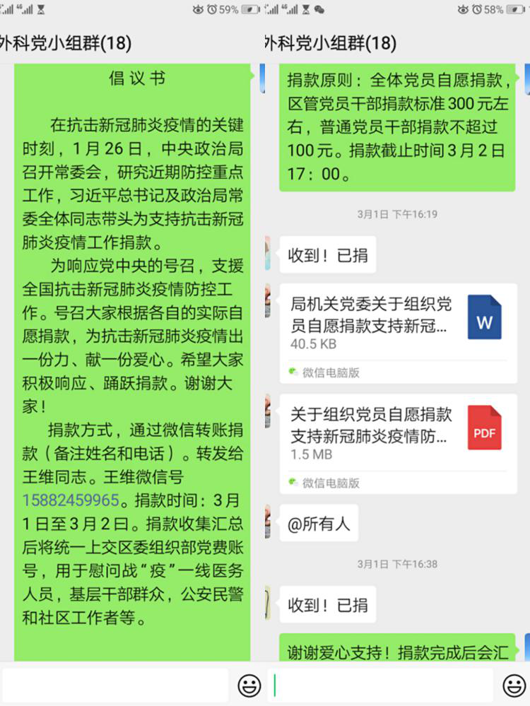 在这次新冠疫情防控阻击战中,广大党员纷纷要求作贡献,在岗党员请战一线,迎难而上,奋勇向前。退休党员尽心尽力筹集防疫物资捐赠一线,发挥党员余热。为打赢疫情防控阻击战,体现了广大党员支持疫情防控斗争的强烈愿望,按照《中共中央组织部关于组织党员自愿捐款支持新冠肺炎疫情防控工作的通知》(组电明字[2020]8号)要求以及省委组织部、市委组织部相关规定,我院党总支发出捐款倡议,各支部积极响应。截止2020年3月3日,中共成都市龙泉驿区中医医院总支委员会共收到来自各支部捐款,捐款金额共计11686元,参与捐款党员110人。