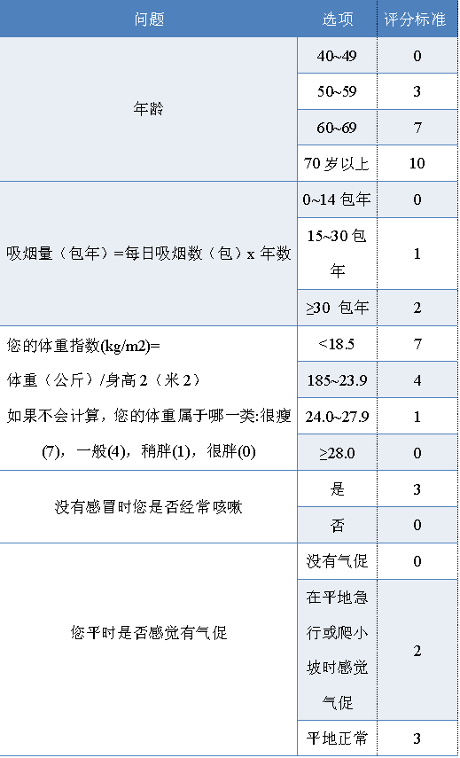 若有以上症状的患者,可以通过以下问卷来筛查是否为慢阻肺高危人群.
