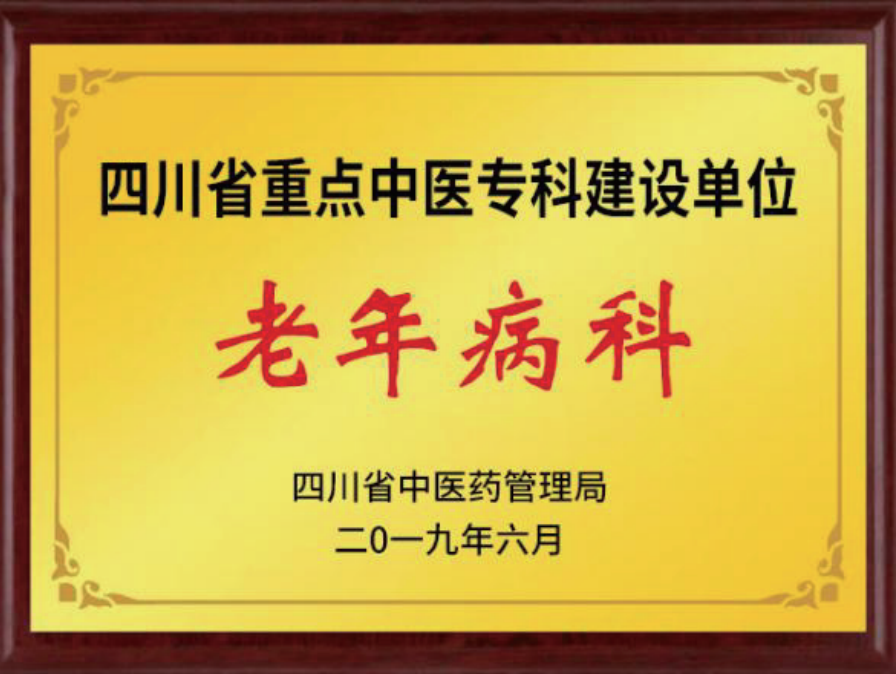 老年病科,从 2012 年 6 月 6 日成立并运行,2013 年 9 月通过评审正式成为成都市重点中医专科,2019 年被评为 四川省重点中医专科建设单位。 成都中医药大学附属医院医联体单位。老年病科设置专科门诊 1 个,综合治疗室 1 个, 病床 50 张。现有成都市名中医 1 名,主任中医师 2 名,副主任医师 1 名,主治医师 1 名,住院医师6人,其中研究生 5 名; 主管护师 5 人,护师 10 人,护士 1 人。科室成员先后到四川大学华西医院、四川省人民医院进修学习。