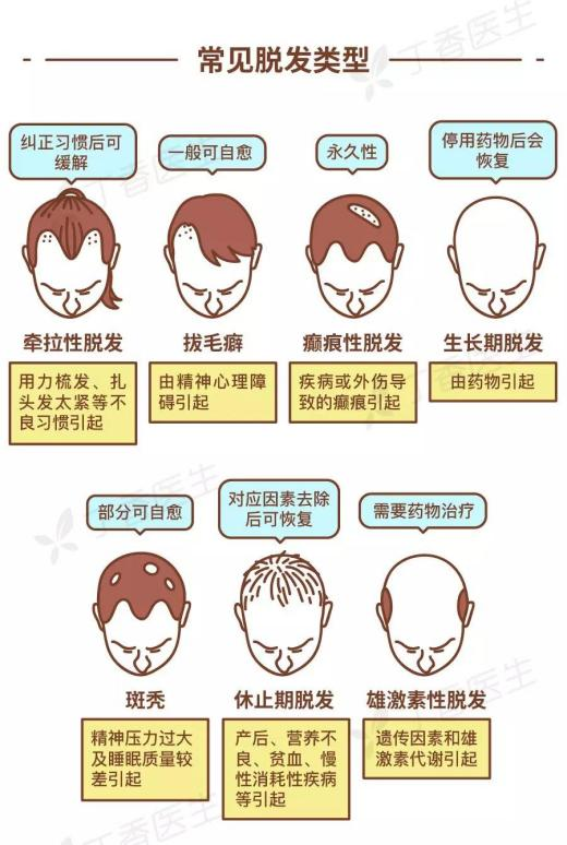 1. 地中海式脱发:又称为雄性激素性脱发,多发生于皮脂腺较为旺盛的人,而且有一定的家族史。