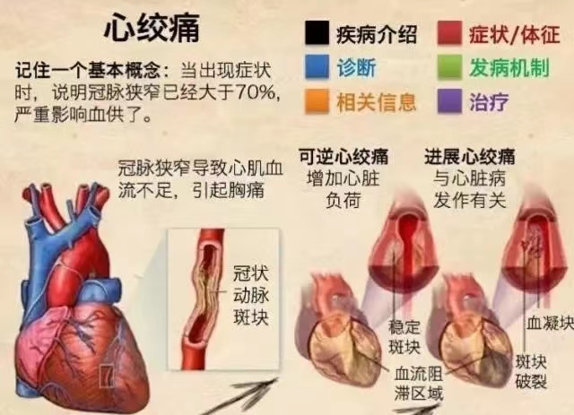 临床上,心绞痛、急性心肌梗死都是极其危险的疾病,典型的心绞痛、急性心肌梗死,疼痛的部位为胸骨后上段或中段,疼痛性质类似压榨样痛,可伴大汗淋漓、呼吸困难等,心绞痛发作一般不超过15分钟;大于30分钟,并伴有濒死感,要考虑急性心肌梗死,需立即就医!