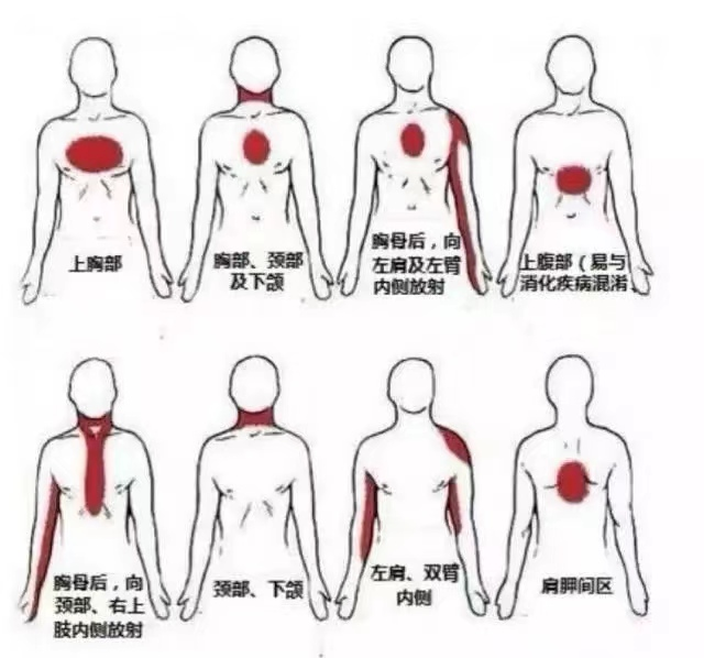 以上是心绞痛或心肌梗死疼痛的放射部位。