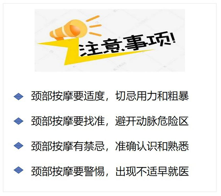 当我们出现颈部不适时,适度采用按摩缓解是可以的,但是要注意不能盲目地、粗暴地进行按摩操作,应采取正规的按摩手法和方式。对于一些患有“三高”的、重度骨质疏松的老年人,当进行颈部按摩时需要特别注意,最好是在专业医生的指导下进行。如果自行在家里进行颈部按摩后出现了头晕、恶心、呕吐、肢体无力等相关症状,一定要立即去正规医院就诊或拨打120急救。