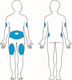 2.注射部位:如下图所示,可选择腹部、大腿或上臂经皮注射给药,万万不能静脉或肌肉注射。