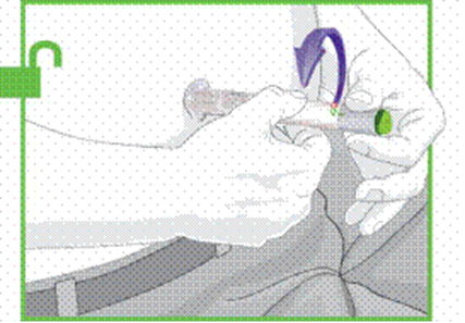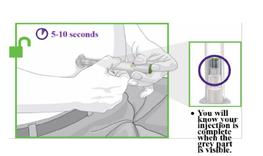 按住绿色注射按钮,会听到一声响亮的咔哒声,继续保持不动,直到听到第二次咔哒声,约在5-10秒内针头开始缩回。