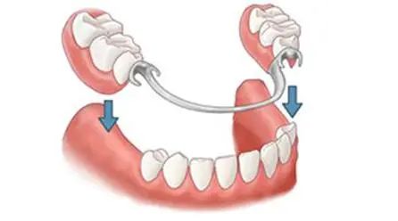它由卡环(老百姓俗称"钢丝钩")、基托、人工牙、支托组成,其原理是通过卡环"钩住"剩余牙齿以稳定假牙,基托连接人工牙以修复缺失。因为有一个“胶托板”,所以刚佩戴时会有异物感,不舒服;另外,活动假牙每天必须取下清洁刷洗,吃饭时容易卡东西,晚上睡前也必须取下,不可戴牙入睡。可见,活动义齿缺点较多,麻烦不少。