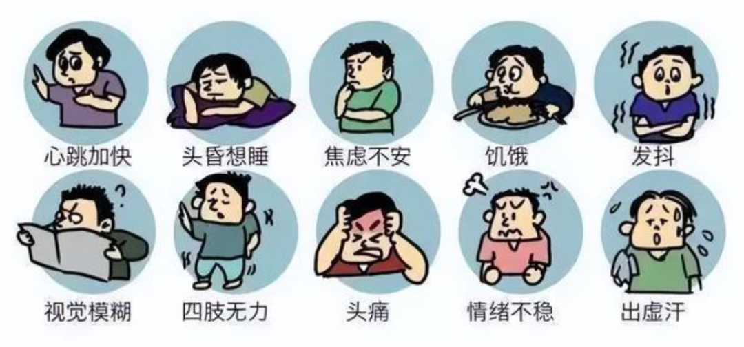 常会出现饥饿感、心慌、手抖、出冷汗、面色苍白、四肢无力、嘴周麻刺感等不适。肢体瘫痪、昏迷、大脑损伤、大小便失禁,甚至危及生命。
