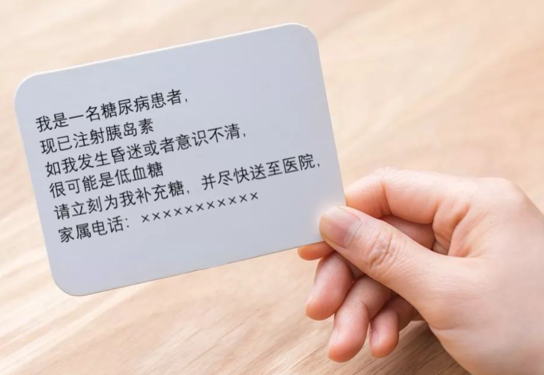 糖尿病病人在外出的时候一定要随身携带两件“防身符”,一件是食物,像糖果、饼干等;第二件是糖尿病急救卡片,上面注明诊断、家庭地址、联系方式以及用药情况,一旦低血糖昏迷时能得到他人的帮助,便于抢救。如果低血糖持续或者频繁出现,应尽早就医。