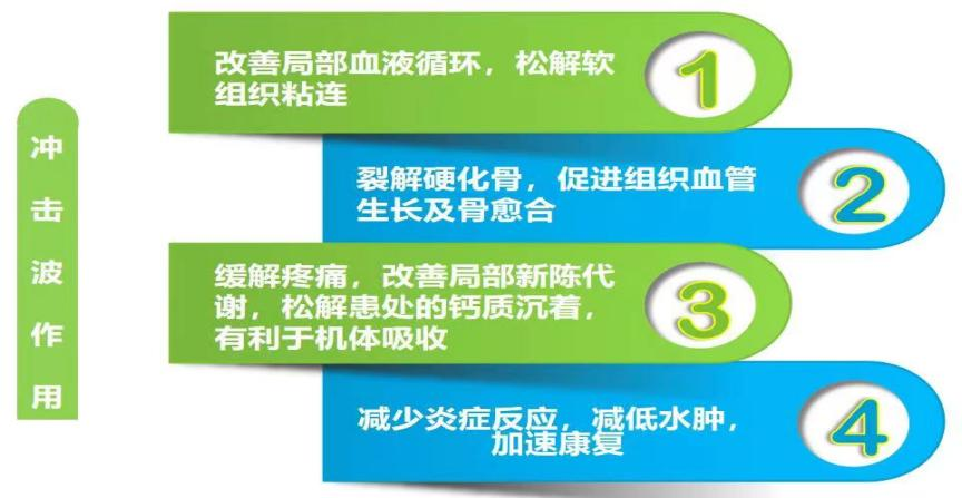 冲击波为当代三大医学奇迹之一,是目前治疗疼痛的全新方式。应用冲击波力学能量,可在肌肉、关节、骨骼等深层组织产生空化效应、应力效应、成骨效应、镇痛效应,从而达到松解组织粘连、改善局部血液循环、粉碎骨刺、促进血管生长因子的产生,加速康复。