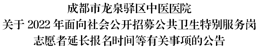 根据《成都市龙泉驿区中医医院2022年面向社会公开招募公共卫生特别服务岗志愿者的公告》及报名情况,经研究,决定延长报名时间至2022年12月2日17:00(周末不报名)。具体面试时间后续将提前在“成都市龙泉驿中医医院”官方网站及微信公众号予以发布,请报考人员随时关注变化情况并做好相应安排。因报考者不主动、不按要求登录相关网站查阅相关信息,导致本人未能按要求参加面试的,责任自负。