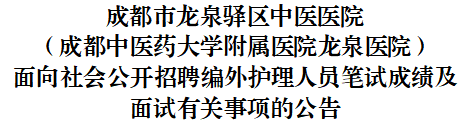 按照《成都市龙泉驿区中医医院(成都中医药大学附属医院龙泉医院)面向社会公开招聘编外护理人员的公告》规定,现发布我院面向社会公开招聘编外护理人员笔试成绩及进入面试人员名单,并就面试有关事项公告如下: