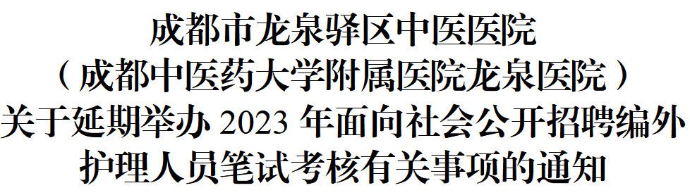 关于延期举办2023年面向社会公开招聘编外护理人员笔试考核有关事项的通知 2023-04-12 17:30组织人事部 (↑点击专题图进入专题查阅更多内容↑)原定于2023年4月15日(周六)举办的2023年面向社会公开招聘编外护理人员笔试考核将延期举行,资格审查合格人员名单及笔试具体时间、地点等其他事项,届时将通过医院官方网站或微信公众号另行发布,请各位考生密切关注医院微信公众号和官方网站,注意查看相关公告。对考核延期给广大考生带来的不便,敬请谅解!咨询电话:028-68284923微信公众号:成都市龙泉驿区中医医院官方网站:成都市龙泉驿区中医医院(http://m.lqzyy.com/)成都市龙泉驿区中医医院(成都中医药大学附属医院龙泉医院)2023年4月12日