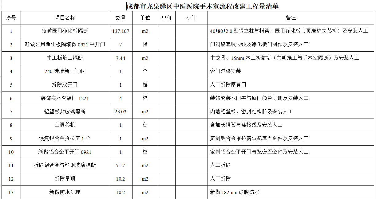 (3)工程内容及规模:按照相关专业规范和甲方要求实施手术室流程改建工程等。详见龙泉驿区中医医院手术室流程改建工程量清单。