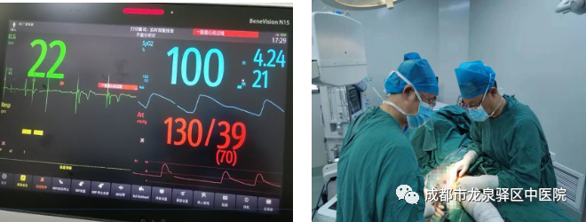面对这种棘手情况,为确保手术安全,骨科主任请示院长后,立即联系我院医联体上级单位——成都中医药大学附属医院(简称附院)心内科专家张德来副主任医师(目前派驻我院担任业务副院长),同时邀请附院麻醉科屈强主任及我院心内科、麻醉科、ICU两院、多学科科主任会诊。大家共同分析患者病情,制定出合理的手术、麻醉、术后管理等方案,向院领导汇报,并征得患者家属同意后,于8月4日13:30将患者接进手术室。先在局麻下,由张德来副院长带领我院心内科张鹏主任为患者植入临时心脏起搏器;紧接着由屈强主任主导,我院麻醉科团队紧密配合,为患者行气管插管静脉全身麻醉,桡动脉穿刺置管监测动脉血压;随后由张成勇主任带领我院骨科团队为患者行股骨粗隆间骨折切开复位内固定手术。由于患者病情较重、体位改变等多种因素,患者心率、血压剧烈波动,整个手术过程异常惊险!心率最慢时22次/分,好在多科室有条不紊、紧密配合、通力协作,一切才有惊无险,顺利完成整台手术。术后患者转入重症医学科康复治疗,目前患者生命体征平稳,精神状态良好。