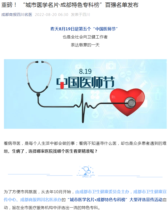 8月19日,由成都市卫生健康委员会主办,成都市卫生健康宣传中心、成都商报四川名医承办的“城市医学名片·特色专科榜”大型评选活动结果正式出炉,我院肛肠科、骨伤科上榜!