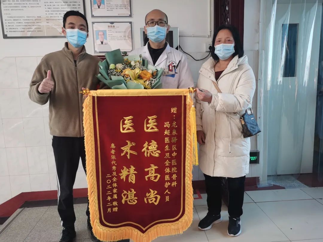 2月28日上午,张女士及其家属将一束鲜花和一面锦旗送到龙泉驿区中医医院骨伤科冯超医师手上,连声感谢冯超、张明华医生以及全部医护人员对自己的精准治疗和精心呵护。