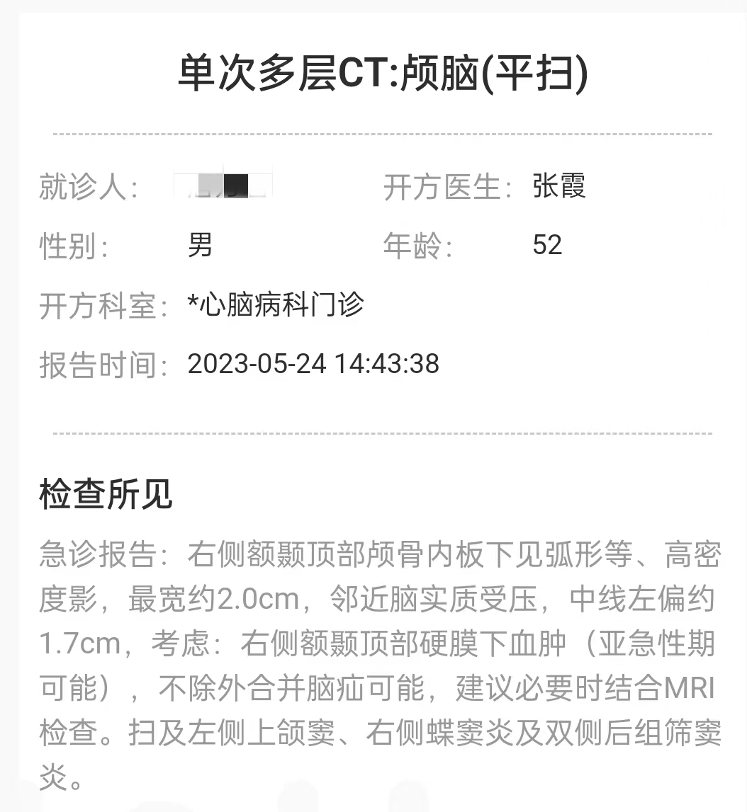 陈岗医师凭借他多年丰富的临床经验及精湛的临床技术,判断以上症状与青光眼无关,考虑以上症状大概率是由于“颅内病变”所引起,便告知患者需进行头颅CT明确诊断。患者及家属当时十分犹豫,但是陈岗医师十分坚持,强烈建议患者完善检查。患者便抱着试一试的态度至我院心脑病科就诊,行头颅CT显示右侧硬膜下血肿(亚急性可能,不排除合并脑疝),建议立即进行手术治疗。