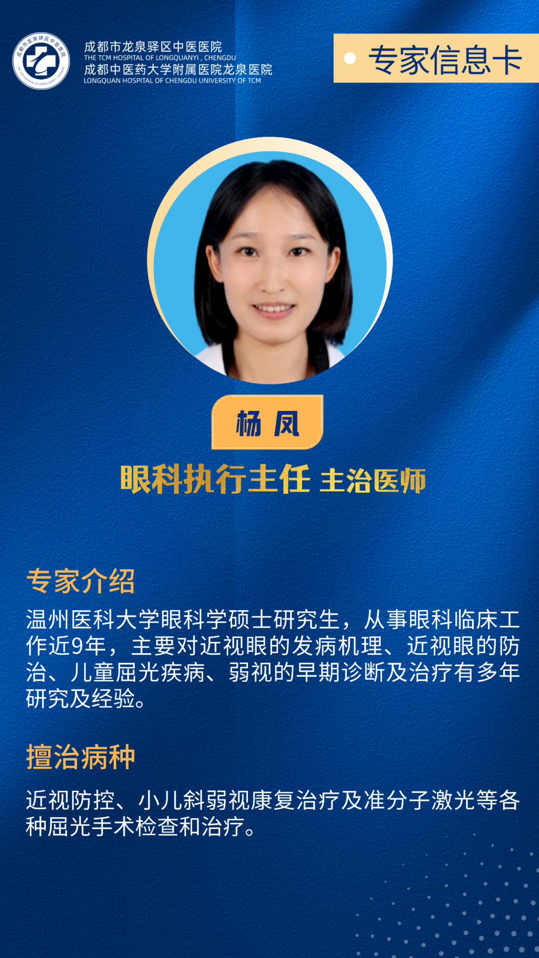 熟练开展常见眼表疾病、泪器疾病、白内障、青光眼、眼底病的手术及激光治疗;尤擅中西医结合治疗视网膜静脉阻塞、糖尿病性视网膜病变、视网膜血管炎等视网膜血管疾病;配有眼视光中心,开展近视防控,弱视、斜视治疗,OK镜及RGP验配;开设干眼门诊,发挥中医特色,以“针药结合”等方式综合治疗眼干燥症、视疲劳。