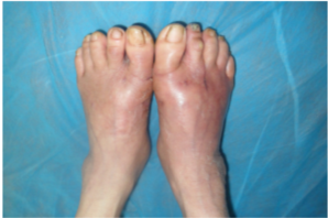 1. 大踇趾的跖趾关节内侧凸起,表面红肿,按压疼痛,穿鞋挤压后明显。造成前足疼痛,久站会加重,严重影响穿鞋行走。