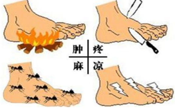1.神经病变表现:远端肢体感觉障碍,主要表现为双下肢麻木,伴有针刺感、烧灼感、蚁走感、感觉减退或缺失,呈袜套样改变,行走时有脚踩棉絮感;足部皮肤干燥而无汗,有皲裂,胼胝体形成。