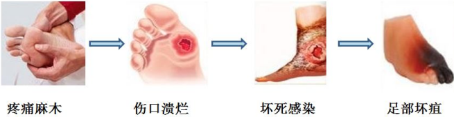 随着病变进展,可出现静息痛,趾端出现坏疽,足跟或跖趾关节受压部位出现溃疡,部分患者可肢体感染。