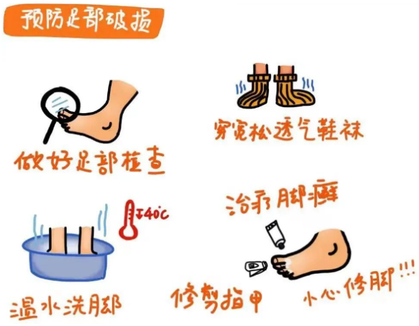 一旦足部出现颜色改变、知觉减退、肿胀、足部感染、疼痛、水泡、鸡眼等不寻常改变,应及时就诊。没有足部问题,也应在专科医生指导下,定期进行下肢神经病变、血管病变的筛查。