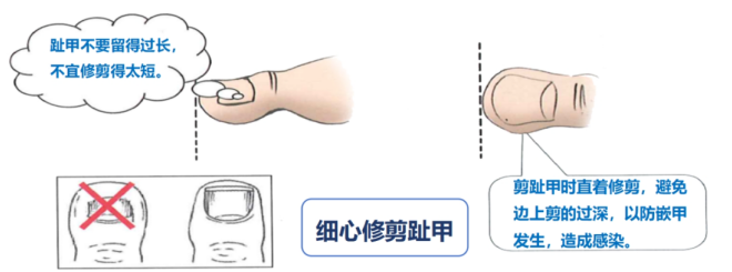 避免脚趾甲长入肉中,损伤皮肤。直着修剪,避免边上剪得过深,剪去尖锐的部分。避免自行修剪或用化学制剂来处理,胼胝、鸡眼,需由专业人员修除;一旦有问题,及时找专科医护人员诊治。