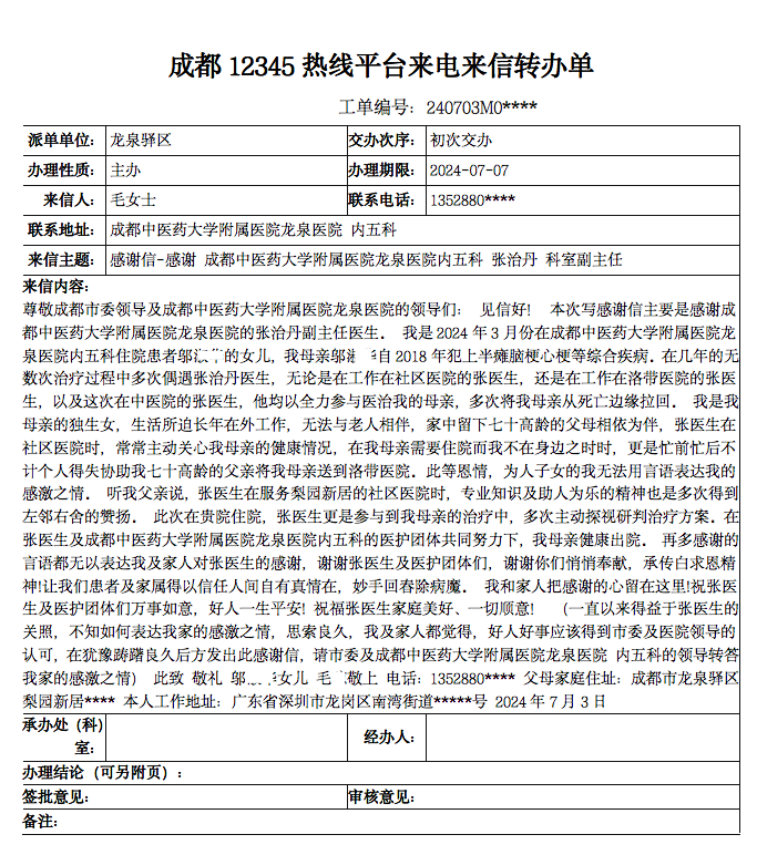 自2018年起,她的母亲便饱受脑梗塞、心肌梗塞等疾病的折磨,在这漫长的治疗过程中,毛女士多次目睹了张治丹医生以其精湛医术和深厚医德为母亲带来生命的希望。毛女士感慨道:“无论是在社区医院,还是在洛带镇公立卫生院,乃至这次在龙泉驿区中医医院,张医生总是全力以赴地救治我的母亲,多次将她从死神手中夺回。”毛女士作为家中的独生女,因工作原因常年在外,无法长时间陪伴年迈的父母,张治丹医生在得知其家庭的特殊情况后,便主动关心其母亲的治疗和生活,甚至在她母亲需要住院而身边无人陪伴时,亲自协助毛大爷将母亲送往洛带医院接受治疗。张医生不仅在医疗上给予了毛女士的母亲无微不至的关怀,更在生活中给予了她如同家人般的温暖。