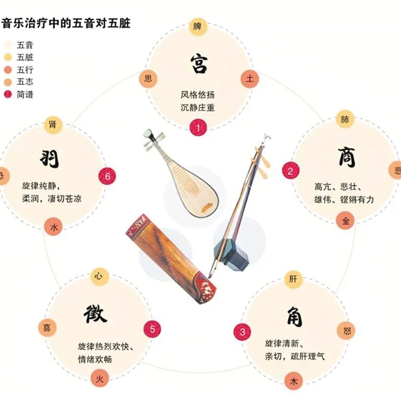 中医巨著《黄帝内经》中就记载道:“肝属木,在音为角,在志为怒;心属火,在音为徴,在志为喜;脾属土,在音为宫,在志为思;肺属金,在音为商,在志为忧;肾属水,在音为羽,在志为恐”。