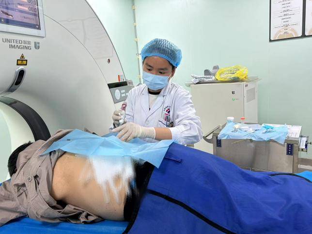患者,男,78岁,近期因右侧肺部占位性病变在洪安镇公立卫生院就诊,由于病情较重,患者和家属选择信任的中医院,通过医联体双向转诊绿色通道迅速转入我院老年病科。经过科室团队的全面评估和深入讨论,在与患者及其家属积极沟通并取得同意后,科室决定为患者实施经皮肺穿刺活检术,以明确占位的性质,为后续治疗提供科学依据。