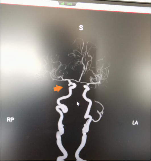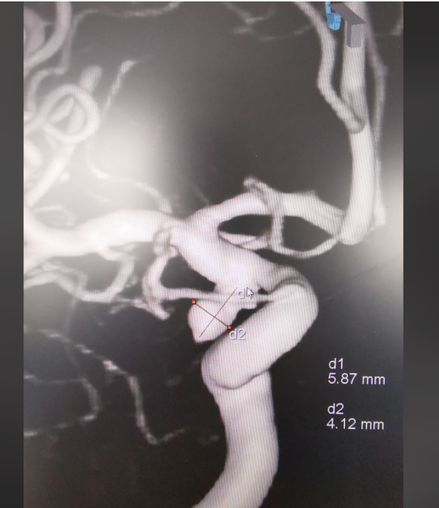 神经外科会诊后,高度怀疑颅内动脉瘤破裂出血,最终经CT血管造影检查(CTA),确诊患者为右侧后交通动脉瘤。