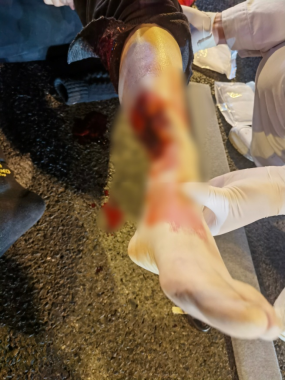 45岁的徐某在驾驶两轮电瓶车时不慎与小汽车发生交通事故。患者伤后左小腿出现创面软组织部分缺失、骨外露、出血、畸形明显等表现。我院120医护人员现场迅速为其进行创面无菌敷料覆盖包扎、止血、骨折处外固定等急救处理,并在转运途中将患者伤情及时发送回医院急诊科,完成了院前急救与院内救治之间信息的及时交换,为患者救治争取了宝贵时间。