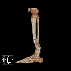 ▲术前CT提示左侧胫腓骨粉碎性骨折,断端移位明显