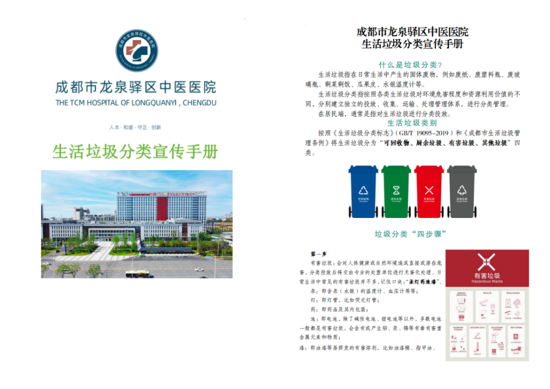 【医院动态】垃圾分类 我们在行动 2024-04-04 10:49院办 垃圾分类 我们在行动成都市龙泉驿区中医医院为深入贯彻《成都市生活垃圾管理条例》规定有效提高医院垃圾分类工作效率我院积极开展了形式多样的生活垃圾分类宣教活动理论培训组织开展全院职工生活垃圾知识专项培训,以增强员工对垃圾分类的认识。印发宣传手册印发生活垃圾分类宣传手册,以引导医院职工及广大群众正确开展生活垃圾分类。视频宣教为更加直观地展现如何进行垃圾分类,后勤保障科拍摄了垃圾分类宣传专题片,就常见易混淆的生活垃圾如何分类投放进行了生动形象的讲解。垃圾分类我们在行动供稿:王 梅、李 婷编辑:刘罗娜校对:陈 健、邓 伟审核:业务分管领导