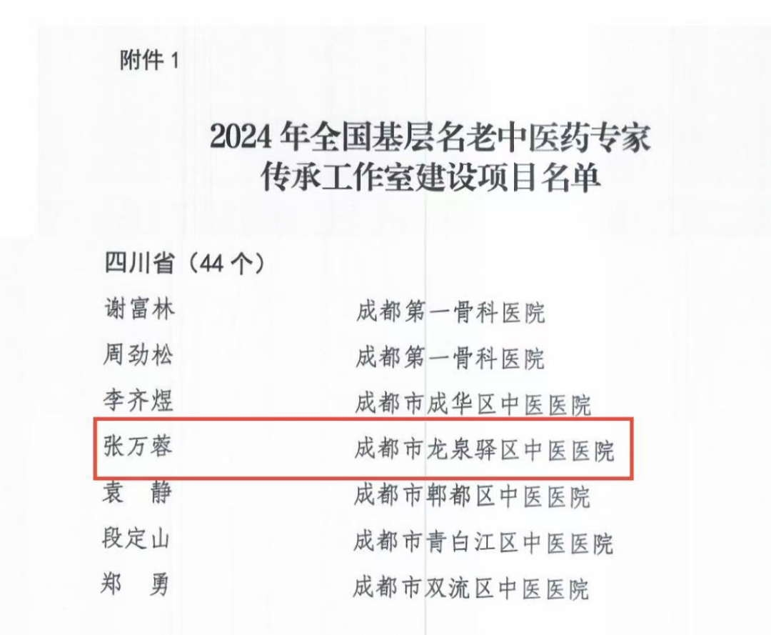 【喜报】国字号荣誉!我院获批全国基层名老中医药专家传承工作室建设项目 2024-12-20 14:08院办 喜 报国字号荣誉近日《国家中医药管理局关于发布2024年全国基层名老中医专家传承工作室建设项目专家名单的通知》中我院康复医学中心张万蓉副主任中医师获批2024年全国基层名老中医药专家传承工作室建设项目热烈祝贺喜报GOOD NEWS“全国基层名老中医药专家传承工作室”建设项目是国家中医药管理局重点实施的中医药发展战略规划,通过建设全国基层名老中医药专家传承工作室,全面深入整理、继承、推广基层名老中医药专家经验技术,培养一个基层名老中医药专家学术经验传承团队,一批继承人。项目入选的专家都是学术经验丰富独到、具有较高社会声誉,临床疗效得到患者及同行公认的基层名老中医药专家。专家介绍:张万蓉 中国针灸学会适宜技术推广委员会第一届、第二届委员会委员,四川省中医适宜技术研究会第一届、第二届理事会理事。擅长:运用针刺、小针刀、刃针、贺普仁针法、浮针等多种中医技术手段治疗颈肩腰膝痛病、顽固性面瘫、三叉神经痛。针刺加艾灸治疗网球肘,梅花针加隔姜灸治疗斑秃,特贺普仁针法治疗内科疾病,火针治疗网球肘、肩凝症、痛风性关节炎及带状疱疹等疾病,穴位埋线减肥,指导患者功能锻炼。传 承 在工作中,张万蓉对患者和蔼可亲、关怀备至,精湛的医术以及高尚的医德让她收获了一大批病友粉丝,甚至连韩国的病友也慕名而至。工作之余,张万蓉还经常受邀到成都中医药大学以及各兄弟单位交流和授课。发 展弘扬中医 此次全国基层名老中医药专家传承工作室的建设,标志着龙泉驿区中医医院在传承发展中医药事业的道路上又迈出了坚实的一步,医院将进一步加强中医药传承工作室的建设和管理,为全区中医人才梯队建设提供有力保障,为新一代中医人继承中医脉络、弘扬中医文化提供平台,让中医中药更好地惠及百姓、服务群众。便 民便民服务张万蓉副主任中医师坐诊信息:就诊地址:龙泉驿区青台山路222号龙泉驿区中医医院门诊4楼针灸/推拿科就诊时间:每周日至周四(法定节假日另行通知)科室电话:028-60659225 028-60659227 供稿:毕 双编辑:李汝余、刘罗娜校对:屈浩然审核:业务分管领导