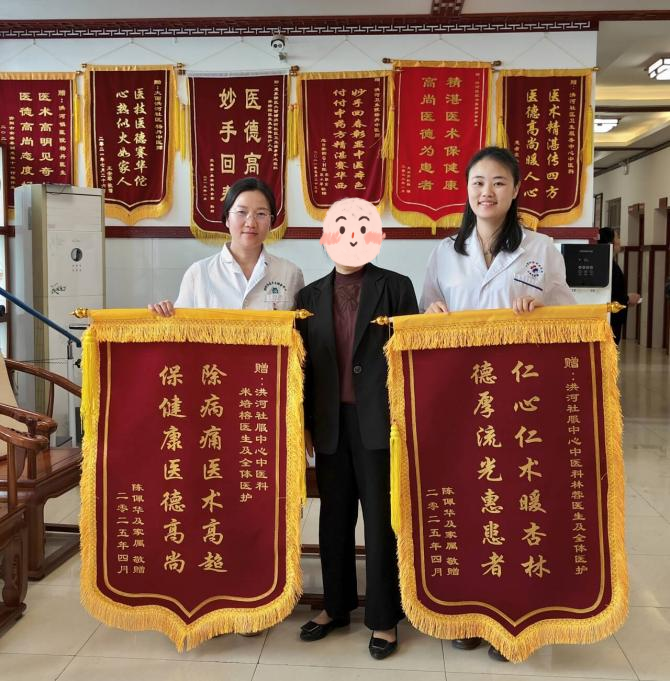 近日,患者陈女士将两面写着“仁心仁术暖杏林 德厚流光惠患者”、“除病痛医术高超 保健康医德高尚”的锦旗分别送到我院派驻洪河社区卫生服务中心专家林蓉以及中心中医科米培榕手上,致谢中心医护团队的精湛医术与细致服务。