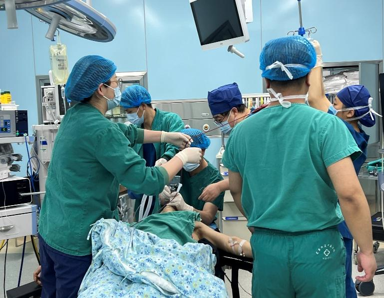 龚德胜主任带领手术团队立即给患者实施“胸腔镜下左侧胸腔探查术”。检查发现患者“左心室损伤伴急性心包填塞”,需紧急解除心包填塞、修补心脏等。