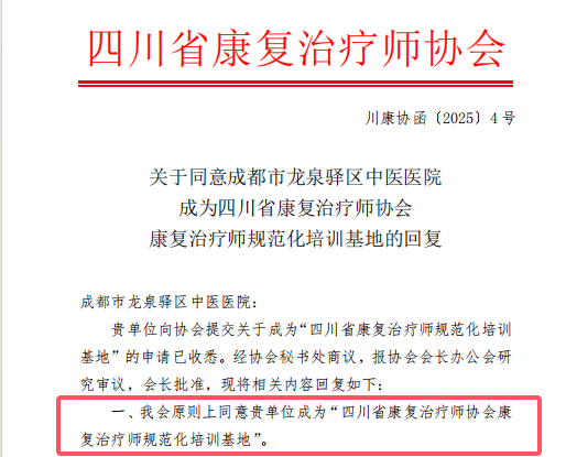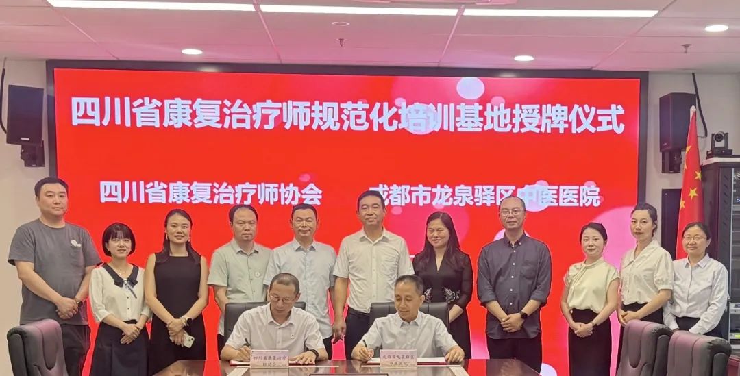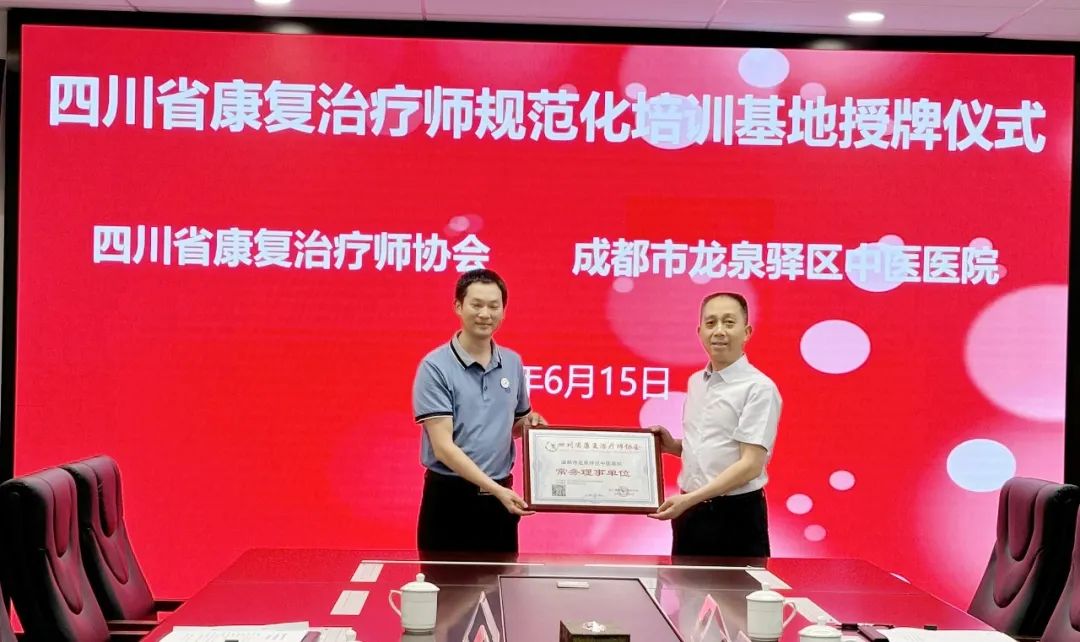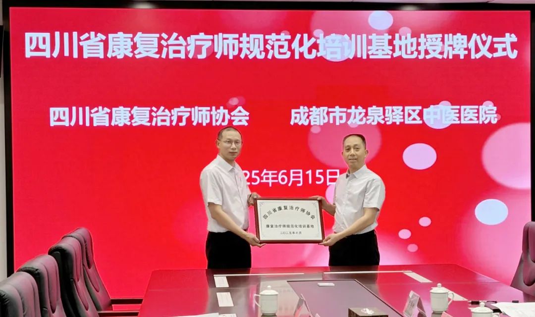 医心“卫”您 | 龙泉驿区首个 “ 四川省康复治疗师协会康复治疗师规范化培训基地 ” 落户我院 2025-06-16 17:00院办 龙泉首个“ 四川省康复治疗师协会康复治疗师规范化培训基地 ”近日四川省康复治疗师协会发布通知同意我院成为“四川省康复治疗师协会康复治疗师规范化培训基地”据了解我院康复医学中心前期经过申报、审议最终正式获批成为“四川省康复治疗师协会康复治疗师规范化培训基地”这是全区首个也是全市第二家康复治疗师规范化培训基地6月15日,我院与四川省康复治疗师协会举办签约授牌仪式,正式成为龙泉驿区首个康复治疗师规范化培训基地!并被授予“四川省康复治疗师协会常务理事单位”称号。据悉,我院康复医学中心是四川省中医重点专科、成都市中医重点专科,工伤康复三期定点科室。现有三个门诊区域(针灸推拿、康复医学、儿童康复),床位196张,建筑面积11000平米,是目前区域内最大的康复医学中心。康复治疗中心有康复治疗师27名(硕士学历3名,在读硕士1名),其中副主任治疗师1名,中级治疗师8名。配备全区总面积最大的现代康复治疗场地,总面积近3000平方,拥有区域内领先的康复技术和设备,为全院病人提供现代康复治疗。康复治疗中心七大亚专业 : 以神经康复为基石,着重开展昏迷促醒、脑卒中、脊髓损伤等重症康复;以肌骨疼痛康复为主干,深度治疗颈肩腰腿痛以及骨质疏松症、骨折术后、创伤康复;联合发展肿瘤康复、心肺康复、儿童康复、精神康复、盆底康复,主治孤独症、发育迟缓、失眠、焦虑、抑郁、颞下颌紊乱、脊柱侧弯等疾病。点亮星标接收最新消息1点击右上角2点击设为星标END往期回顾NO.101重点专科 | 康复医学中心:区域领先!规模最大!这个 “ 四川省重点中医专科 ” 太硬核了......02我院康复医学团队进入国家级学术平台:PNF联合rTMS技术为卒中康复提供新方案 供稿:丁 来、侯 雨 编辑:唐友丽 校对:屈浩然 审核:业务分管领导点赞分享在看留言