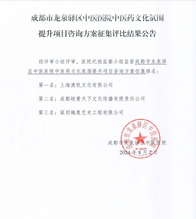 成都市龙泉驿区中医医院中医药文化氛围提升项目咨询方案征集评比结果公告 2024-08-02 10:48院办 经评审小组评审,医院纪检监察小组监督成都市龙泉驿区中医医院中医药文化氛围提升项目咨询方案征集结果如下:
