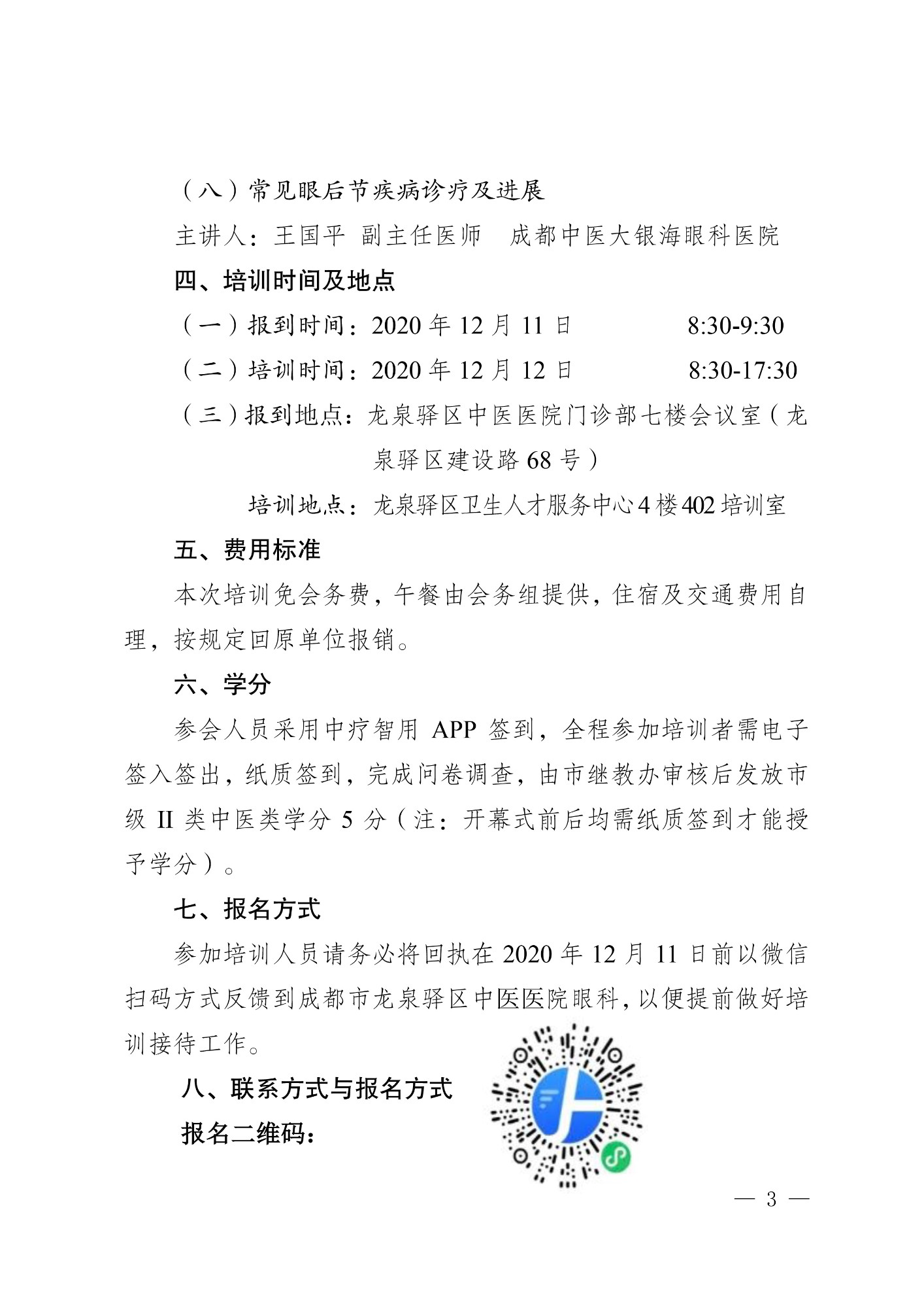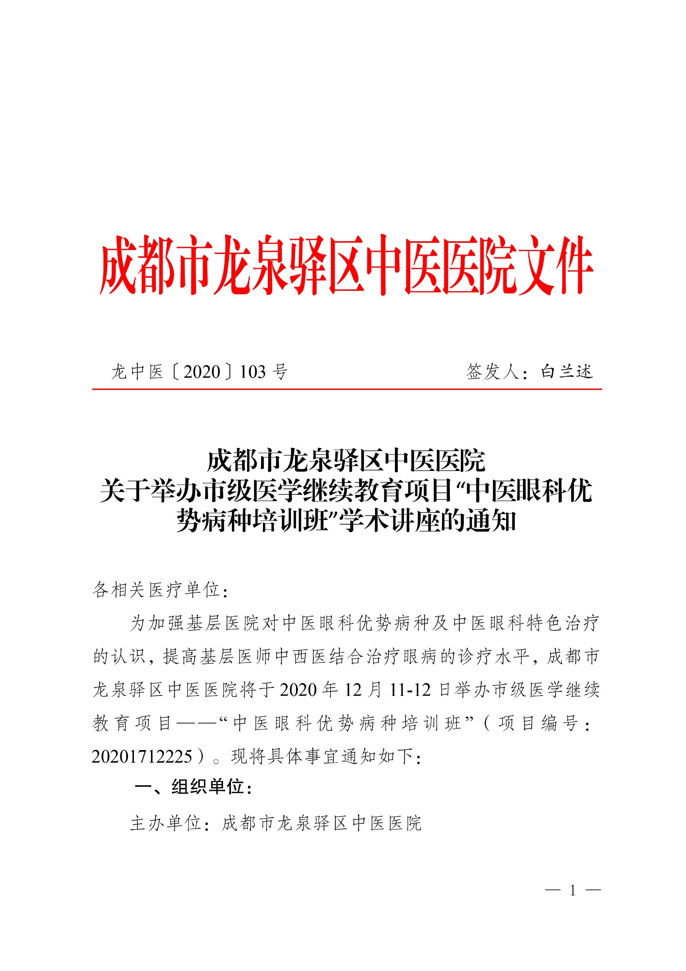 成都市龙泉驿区中医医院 关于举办市级医学继续教育项目“中医眼科优势病种培训班”学术讲座的通知