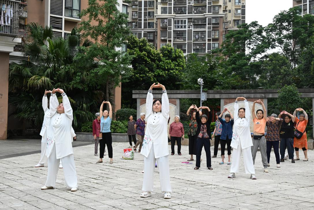 在活动现场,志愿者们为居民们带来了现场八段锦教学,现场的气氛非常活跃,居民们积极参与,感受着八段锦带来的身心放松和健康益处。